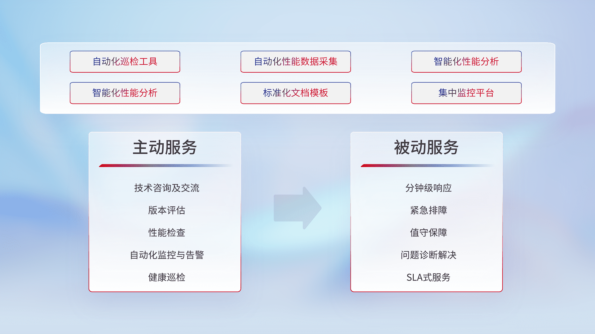 智能化工具和标准化文档,,保障服务质量,,,,提供主动服务(包含技术咨询、、、、版本评估、、、、性能检查、、、、自动化监控与告警、、、、健康巡检)和被动服务包含(分钟级响应、、、紧急排障、、、值守保障、、、、问题诊断解决、、SLA服务)。。。